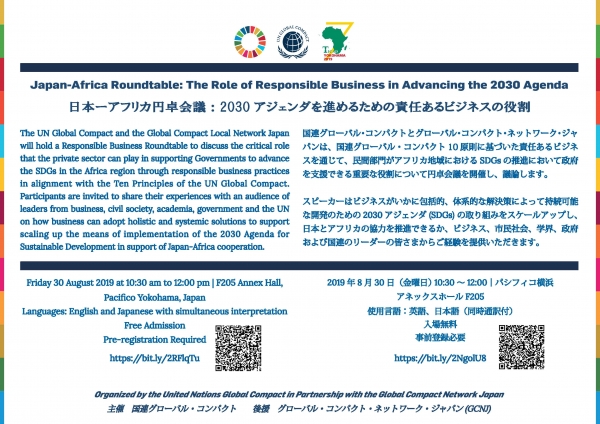 【国連グローバル・コンパクト主催 GCNJ後援】 TICAD7公式サイドイベント『日本ーアフリカ円卓会議: 2030アジェンダを進めるための責任あるビジネスの役割』(終了しました)