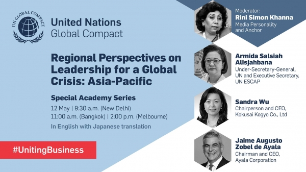 国連グローバル・コンパクトは5月12日、「アジア太平洋視点から見た危機を生き抜くリーダーシップ」と題したAcademy特別ウェブセッションを開催しました。この記事では、「#UnitingBusiness to Respond to COVID-19」キャンペーンの一環として開かれたこのセッションについて、概略をレポートします。ご関心・ご興味のある方はぜひご覧ください。