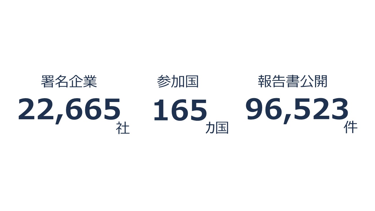 国連グローバル・コンパクトとは、各地の企業が、その事業や戦略を、人権、労働、環境、腐敗防止の分野にわたる10原則に沿ったものとし、SDGsに貢献する行動をとるための、国連事務総長の特別イニシアチブです。162を超える国々で、18,000以上の企業及び3,800以上の非営利団体が署名し、62のローカル・ネットワークを持つ、世界最大のコーポレート・サステナビリティ・イニシアチブです。