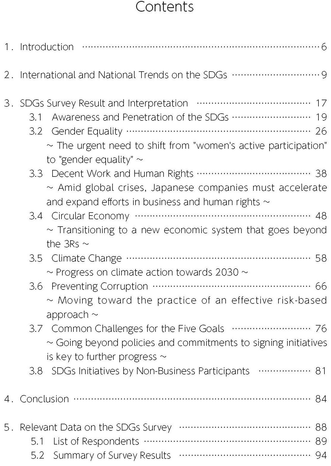 2023年3月6日に発行した「SDGs進捗レポート 2023」では、2022年9~11月に行った調査に基づき、SDGsに関する認知度のほか、国連グローバル・コンパクト(国連GC)が重視するSDGsのゴール5、8、13、16と、日本企業で取り組みの加速が期待されるゴール12の計5つのゴールの取り組みの進捗について、各分野の専門家による分析・考察をまとめています。