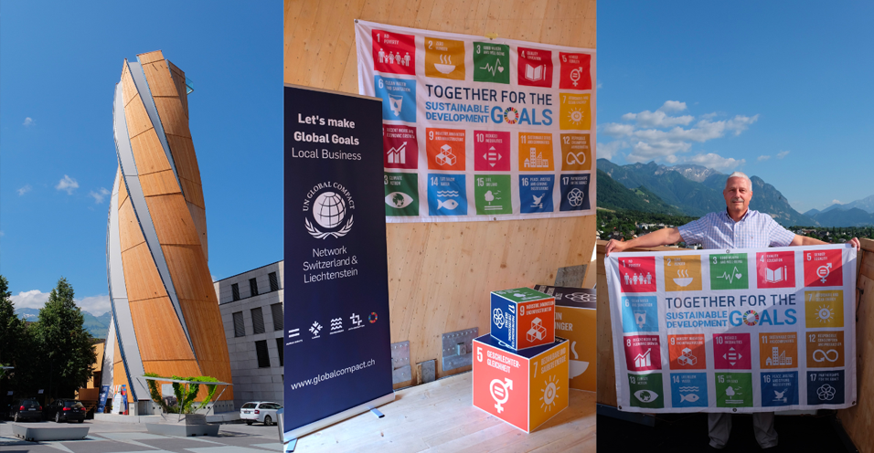 リヒテンシュタインのシャーンにある高さ35メートルのタワーは展示、対話のプラットフォーム、ミーティングの場です。国連グローバル・コンパクト・ネットワーク・スイス&リヒテンシュタインの主催により、17週間にわたる双方向型イベントを開催中。来訪者は、タワー最上部の10階から山の景色を満喫できます。