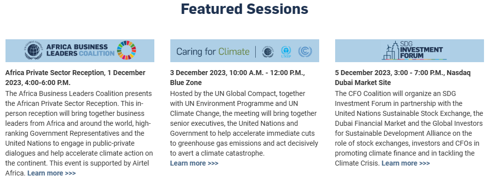 国連グローバル・コンパクトは、アラブ首長国連邦のドバイで開催されている国連気候変動枠組条約第28回締約国会議(COP28)において、民間セクターの気候変動対策を推進するため、各国首脳、閣僚、企業経営者、市民社会等を招集し、以下のセッションを共催いたしました。