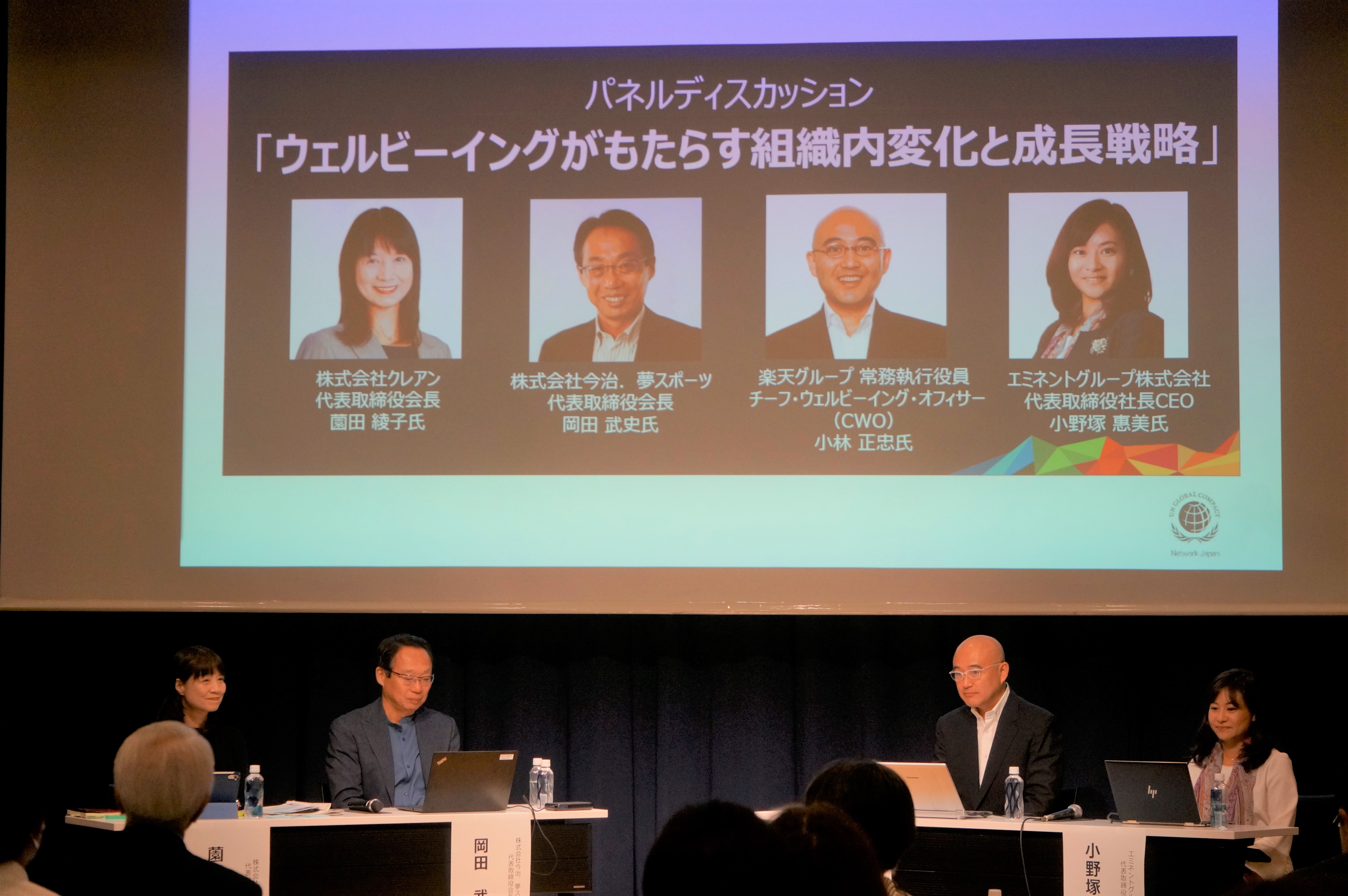 パネルディスカッションでは、ウェルビーイング経営を実践されている楽天グループ・小林正忠執行役員、「ESGの女神」と評されているエミネントグループ・小野塚恵美CEOにご登壇いただき、岡田武史会長とともに様々な観点からウェルビーイングのもたらす好循環について議論いただきました。