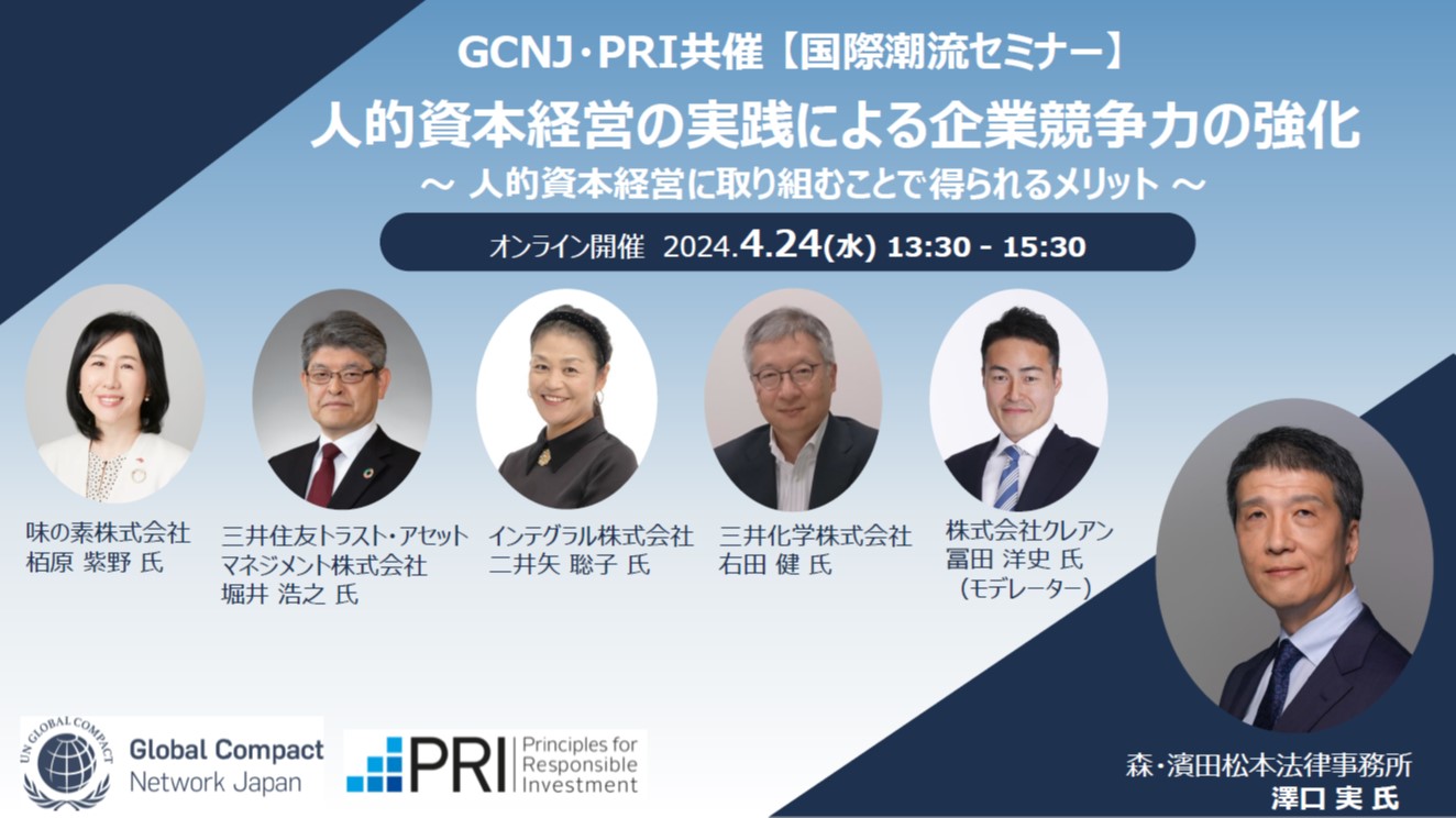 4月24日(水)、グローバル・コンパクト・ネットワーク・ジャパン(GCNJ)とPRIは、「人的資本経営の実践による企業競争力の強化~ 人的資本経営に取り組むことで得られるメリット ~」をテーマにオンライン・セミナーを開催いたしました。基調講演および企業サイドと投資家サイドのパネルディスカッションを行いました。視聴者との質疑応答も活発に行われ、盛況のうちに閉会いたしました。ご登壇いただきました皆さま、ご参加くださいました皆さま、誠に有難うございました。