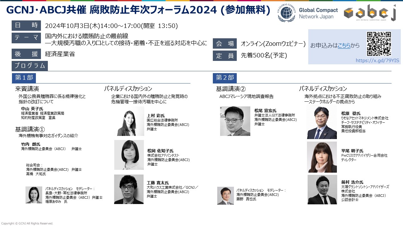 今回のフォーラムでは、贈賄防止の最前線として、国内外における接待汚職や不正腐敗を巡る企業の対応を中心に議論いたします。