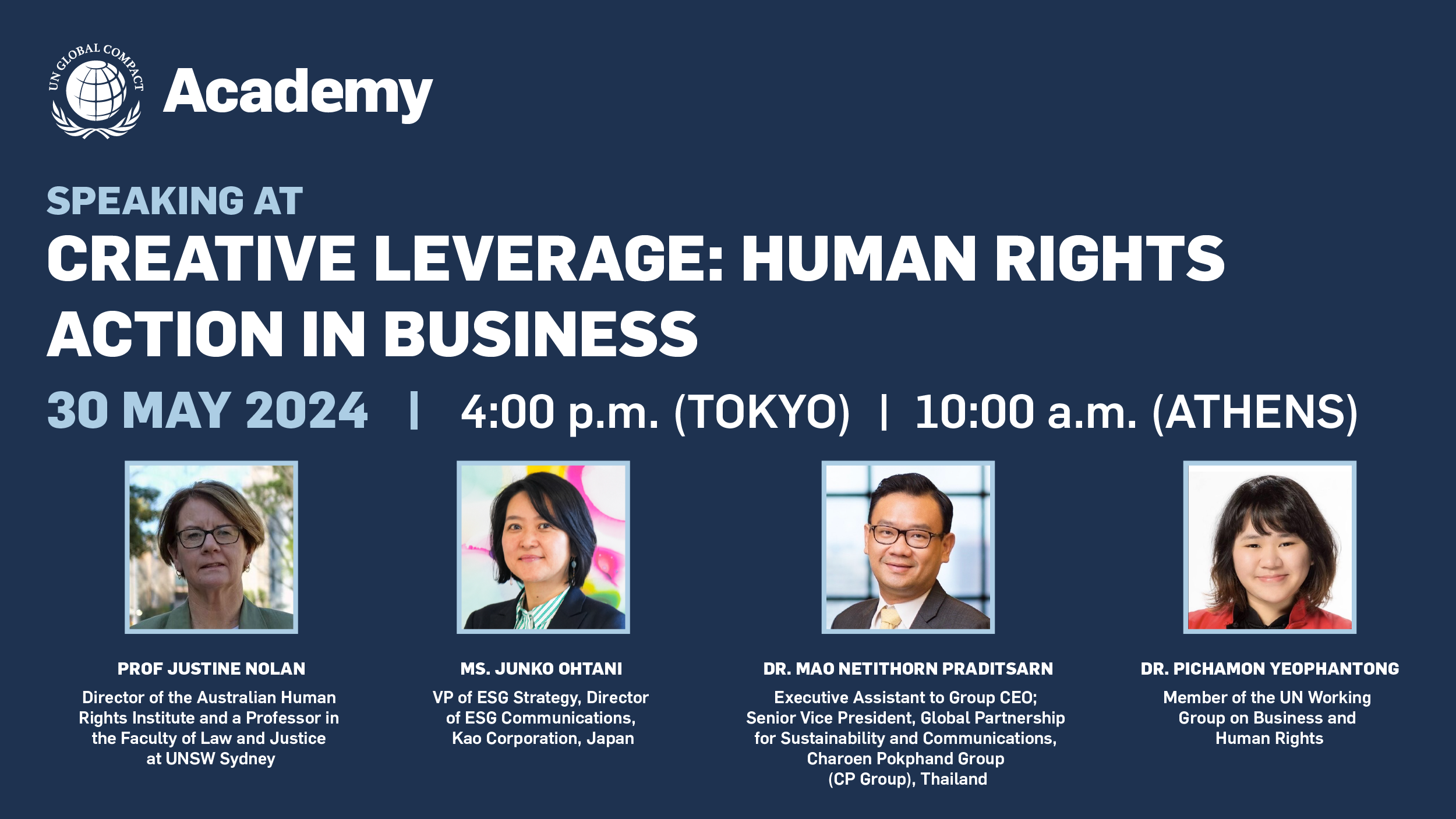 国連グローバル・コンパクト・アカデミーでは、去る2024年5月30日、人権ウェビナー・シリーズ第一弾として、企業が人権への負の影響に対処する上でしばしば求められる、「創造的な影響力の行使」についてライブ・セッションを開催し、GCNJ会員企業にもご登壇いただきました。