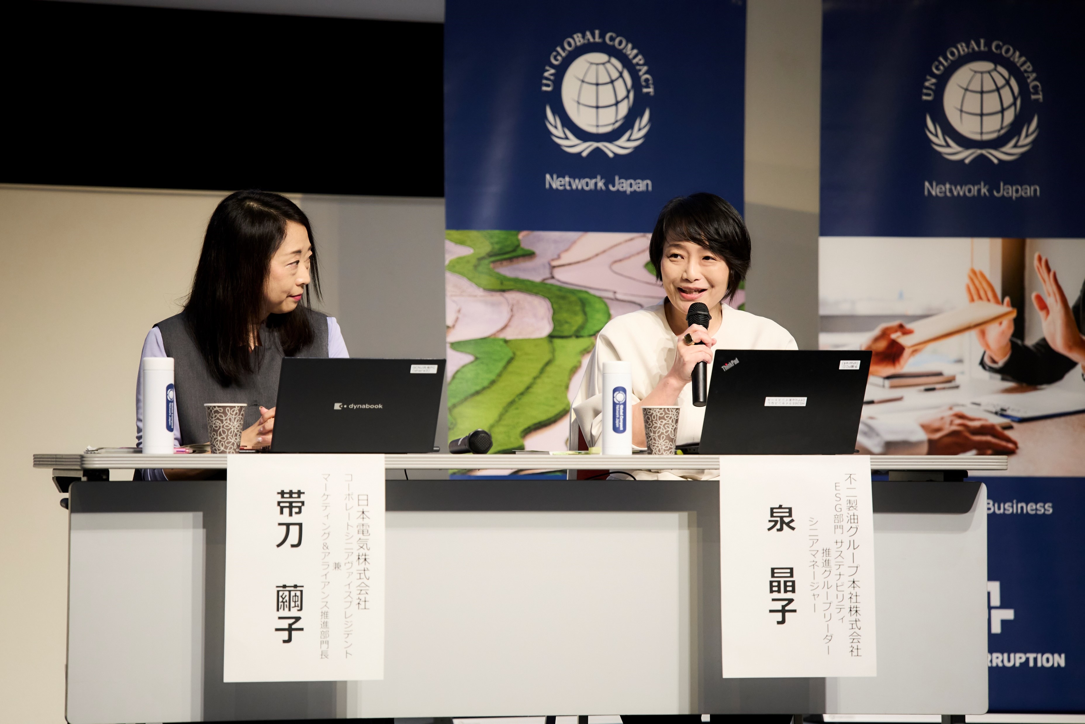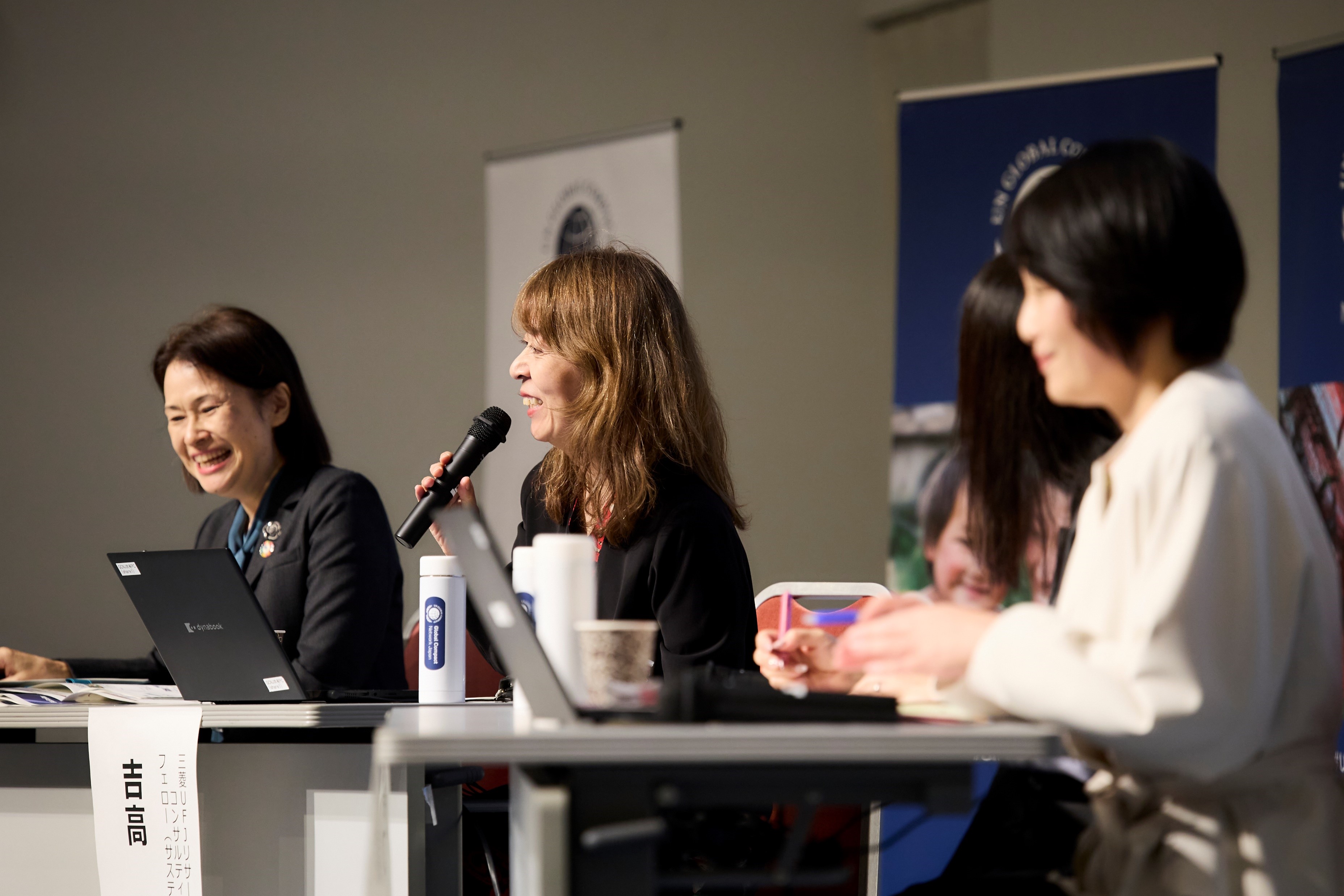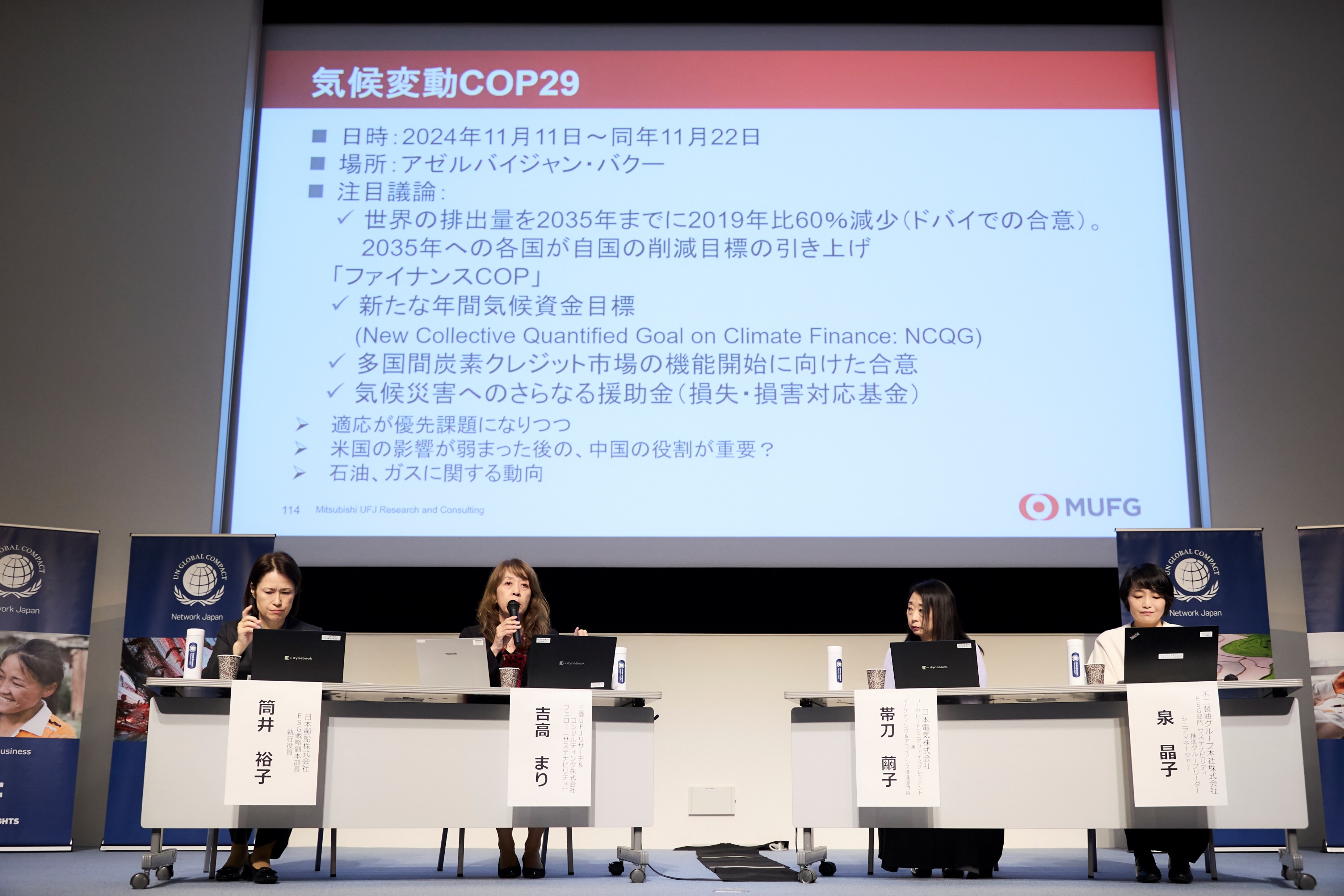 パネルディスカッションでは、三菱UFJリサーチ&コンサルティング株式会社 吉高まり氏、日本電気株式会社 帯刀繭子氏、不二製油グループ本社株式会社 泉晶子氏にご登壇いただき、GCNJ理事である日本郵船株式会社 執行役員の筒井裕子氏にモデレーターを務めていただきながら、このVUCAの時代でビジネス機会をどう作り出しているのか、ポスト産業資本主義を見据えて、今まさに変革に取り組んでいる企業の視点と、それに対する企業価値を評価する投資家の視点で議論いただきました。