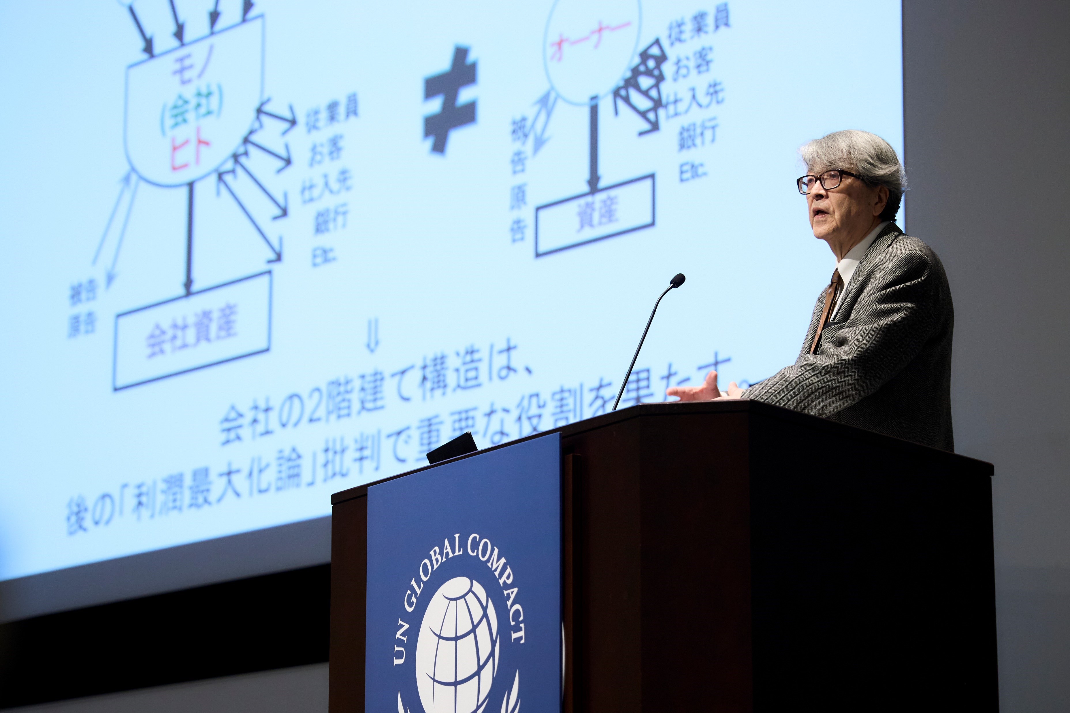 本シンポジウムでは、サステナビリティ社会の実現に向けた企業の「変革」をテーマに取り上げ、神奈川大学特別招聘教授 岩井克人氏より、会社とは何か、という本質的な問いから企業経営者の役割やその構造・企業の目的といった内容を中心に基調講演をいただきました。