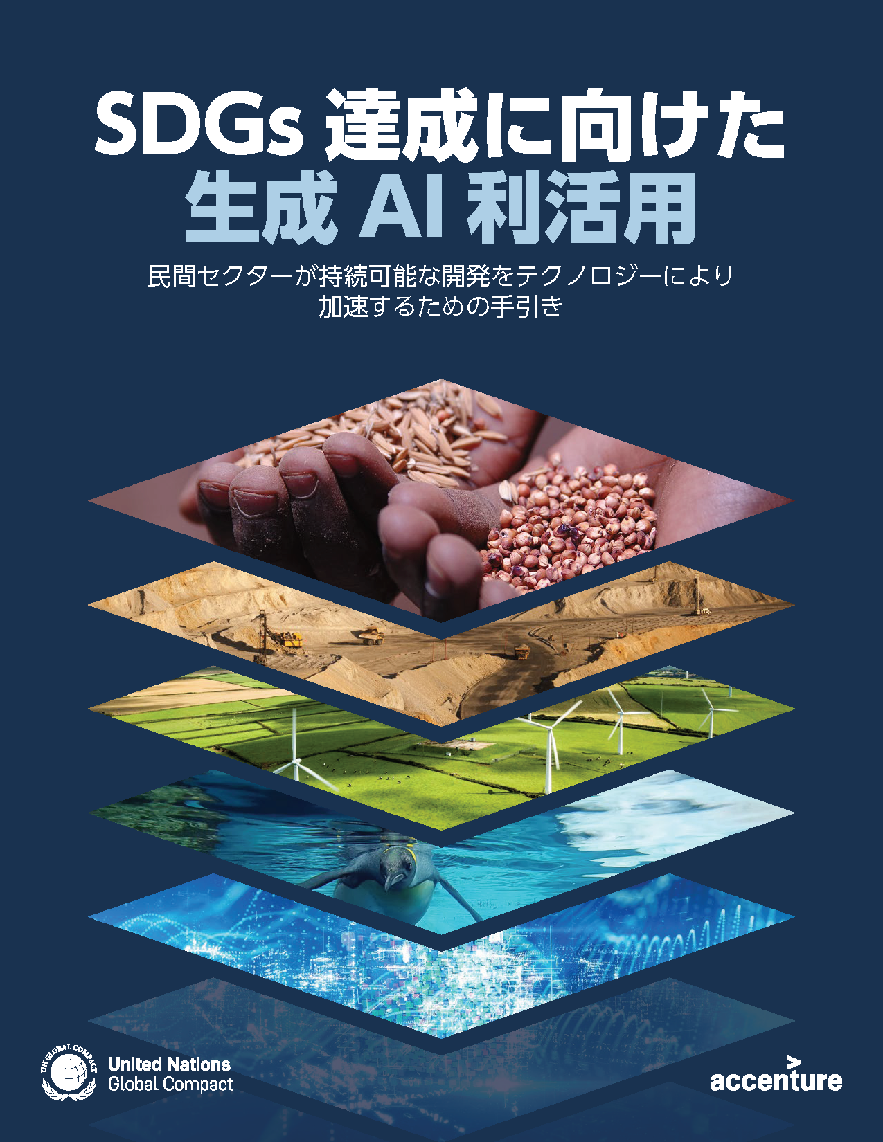 更新日:国連グローバル・コンパクトでは、これまでもアクセンチュア社と協力してまいりましたが、その協働から生まれた最新の成果物が、「SDGs達成に向けた生成AI利活用」です。本報告書は、AIという革新的技術を、持続可能な開発のために民間セクターがいかに使用できるかについて、包括的に掘り下げる内容となっています。具体的には、生成AI利活用に伴うリスク管理について、実行に移せる戦略、実際のケース・スタディ、およびインサイトを掲載しています。加えて本報告書では、民間セクターの先駆者たちが自社の経験を基に語った生成AIに関するインサイトも紹介しつつ、企業が責任ある形で生成AIを扱う上で、すぐに役立つリソースを提供します。