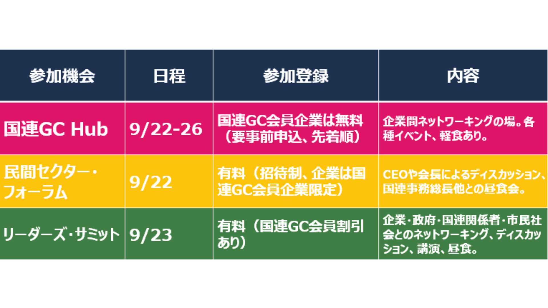 期間中、国連GCではリーダーズ・サミットを含め、ニューヨークの国連本部周辺で主に3つの参加機会をご用意しております。いずれも、世界各地から集まる企業関係者等と共に、サステナビリティについて実務に役立つ最新の知見を得たり、ネットワーキングを行ったりできる貴重な場となります。