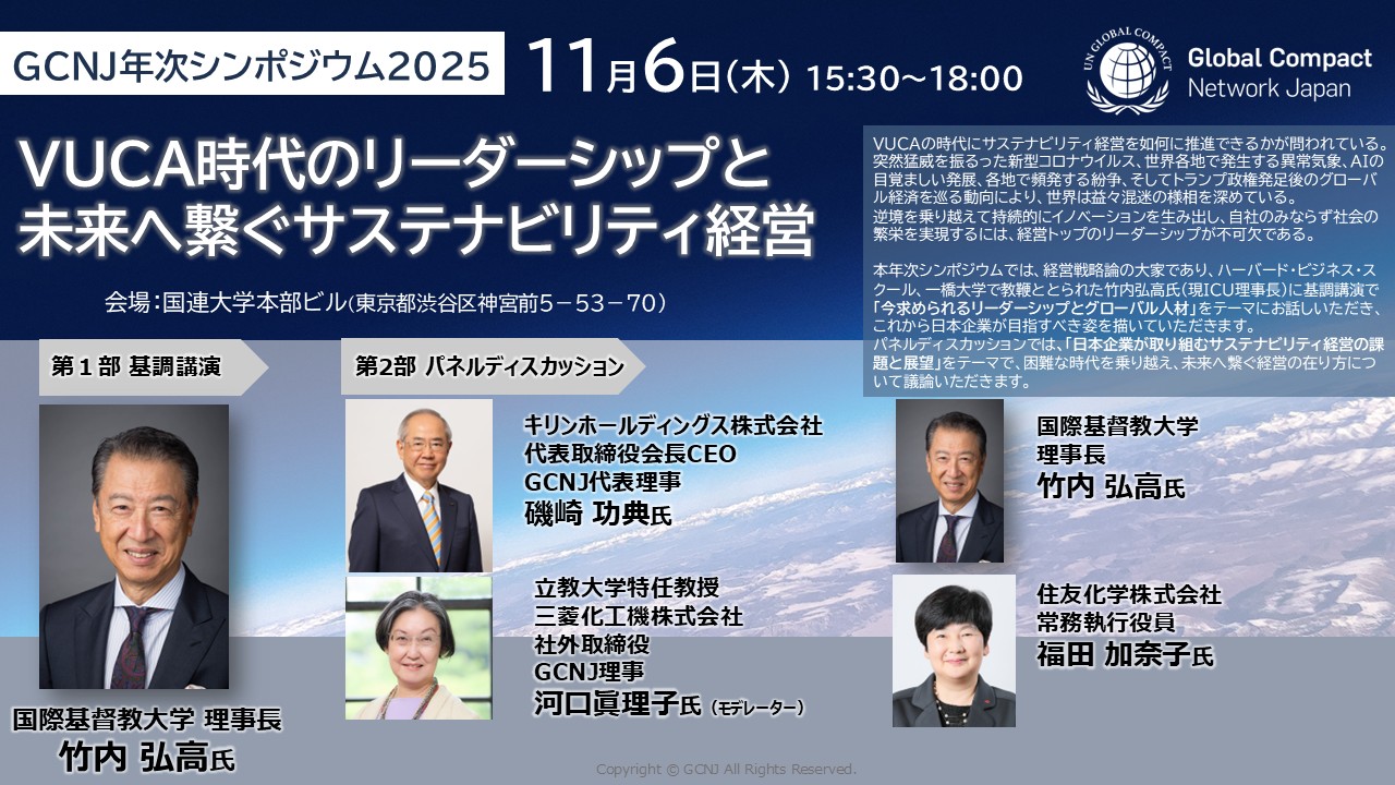 一般社団法人グローバル・コンパクト・ネットワーク・ジャパン(GCNJ)は、11月6日(木)、国連大学本部ビル(東京都渋谷区)にて年次シンポジウムを開催します。本年次シンポジウムは、『GCNJ年次シンポジウム2025~VUCA時代のリーダーシップと未来へ繋ぐサステナビリティ経営~』と題し、経営学者・竹内弘高氏(国際基督教大学理事長)、2025年6月にGCNJ代表理事に就任した磯崎功典(キリンホールディングス株式会社代表取締役会長CEO)が登壇予定です。