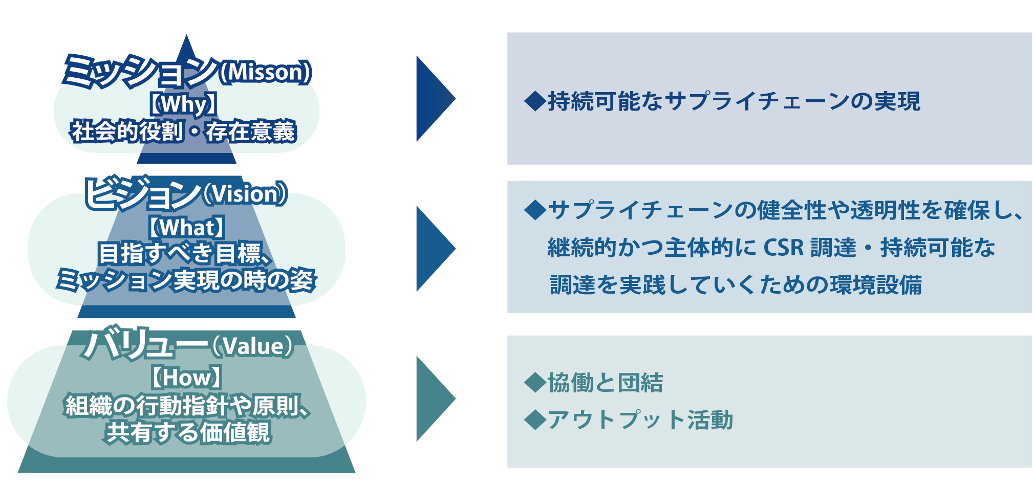 提言書の改定に伴い、改めてCSR 調達・持続可能な調達の「あるべきプロセス」を議論する過程で、分科会としてのミッション・ビジョン・バリューを制定しました。本分科会のミッションは「持続可能なサプライチェーンの実現」です。上流だけでなく自社内や下流も含めたサプライチェーン全体において持続可能性を実現していくことを目指します。また、ビジョンとして「サプライチェーンの健全性や透明性を確保し、継続的かつ主体的にCSR 調達・持続可能な調達を実践していくための環境整備」を掲げています。CSR調達・持続可能な調達にむけた一連の取り組みを企業が実施していくために有用なツール等を提供することで、望ましい調達慣行を実践しやすい環境を整備していきます。最後に、本分科会のバリューですが、これには「協働と団結」および「アウトプット活動」の2つを定めています。サプライチェーン上のステークホルダーとの協働、分科会内での協働と団結により、アウトプットを創出することが本分科会でのバリューとなります。