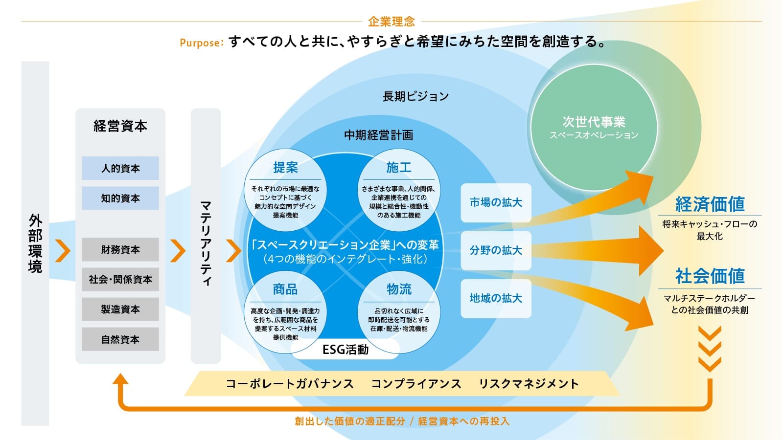 2024年1月に新たな企業理念を策定し、「すべての人と共に、やすらぎと希望にみちた空間を創造する。」をパーパスとして、⻑期ビジョン【DESIGN 2030】において「Inclusive (みんなで)」「Sustainable (いつまでも)」「Enjoyable (楽しさあふれる)」な社会の実現に向けて貢献していくことを掲げています。