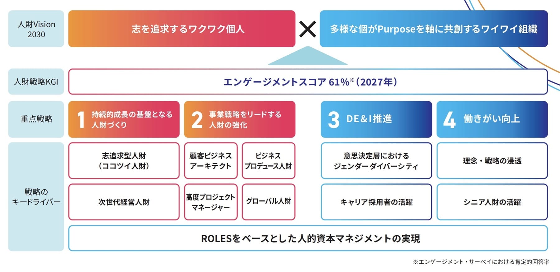 ※2024年6月に実施した調査のうち、「働きがい」と「働きやすさ」に関する7つの設問の肯定的回答率の平均を基準値として設定 - 配偶者が出産した男性社員のうち、育児のための休業・休暇を取得できた人の割合:100%(2025年度)