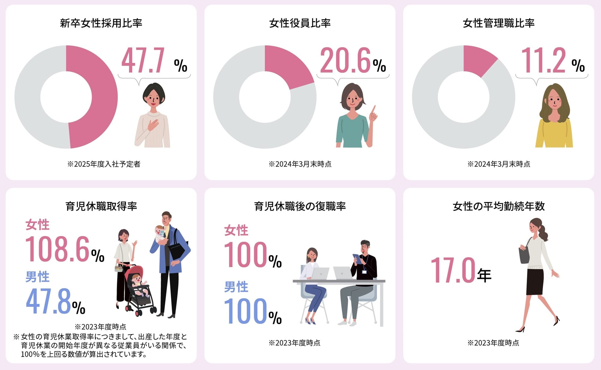 これらの継続的な努力の結果、例えば育児休業を取った女性社員の復職率は100%となっています。